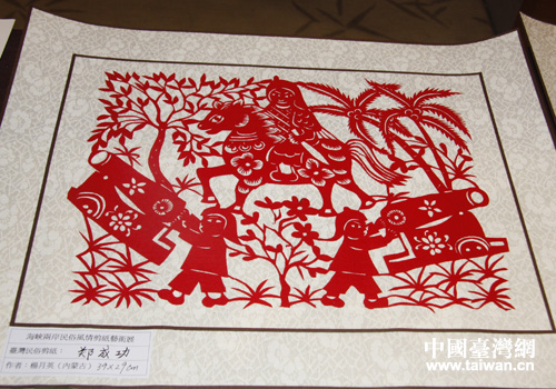 前门大街上年味浓浓的剪纸作品。(中国台湾网 郭庆娜 摄)