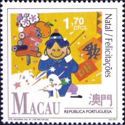 澳门1991年11月29日发行一套4枚《祝贺》邮票,其中一枚中式打扮的男童燃放鞭炮(图②),背景可见桃花、年橘、倒贴的“福”字和印有“吉”字的利是封,洋溢着浓郁的过年气氛。