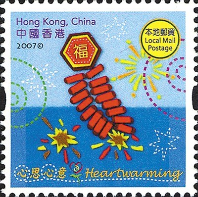 香港2007年12月28日推出的一套4枚《心思心意》邮票,有一枚直接以一挂燃放的鞭炮为主图(图③),鞭炮上端还印着一个大大的“福”字,构图简洁明了,寓意深刻。(文/司徒一凡)