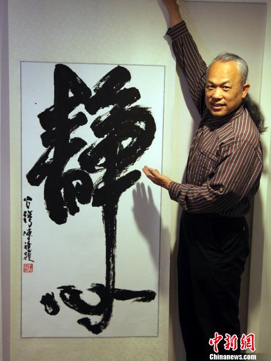 台湾著名微雕家陈逢显以一幅书法“静心”参展。他说,台湾社会近期有些浮躁之气,故挥毫写了“静心”两字参展。陈逢显除精于微雕艺术外,在书法、素描、油画、雕刻、捏塑陶瓷等也都有修为。近10年来更不遗余力,积极促进两岸书法艺文界之间的文化交流。他的毫芒雕刻馆,也常成为大陆书家来台的参访之地。