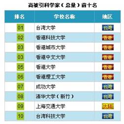 ① 学术大师:据汤森路透公司开发的“高被引科学家”数据库近三十年来的统计显示,台湾高校拥有许多有影响力的国际学术大师。在这一指标上名列两岸四地前十名的台湾高校分别为台湾大学(1)、成功大学(7)、新竹清华大学(8)、台湾科技大学(10)。而相对台湾、香港高校,大陆则较为欠缺有国际影响力的学者。前十名榜单请参看:
