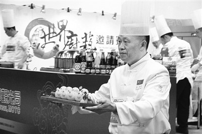 2014台湾美食展8月15日至18日在台北举行。图为美食展举办的世界厨艺邀请赛上,来自河南“阿五美食”的师傅把功夫菌汤端向评委席。