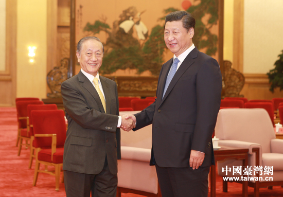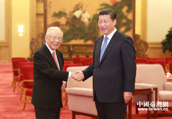 9月26日上午,中共中央总书记习近平在北京人民大会堂会见了由新同盟会会长许历农、新党主席郁慕明率领的台湾和平统一团体联合参访团。图为习近平与许历农亲切握手。 (中国台湾网 田云鹏 摄)
