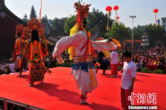 台北霞海城隍庙与厦门霞城城隍庙联合上演精彩的城隍阵头。 高淑萍 摄