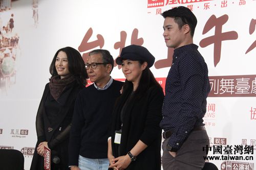 吴念真编剧执导的“这些人那些事”大陆版舞台剧《台北上午零时》于2015年1月22日国家大剧院首演。1月23日,吴念真携两位主创黄韵玲(右二)和吴定谦(右一)参加公演礼。(中国台湾网 张洁 摄)