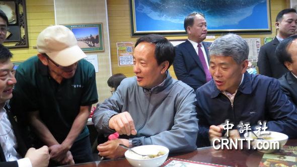 李建华与豆花店老板交换心得,发现北方味道属咸的豆腐脑到了南方台湾变成甜品豆花赞叹不已。(中评社 倪鸿祥摄)