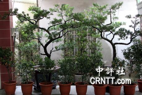 王金平老家玄关尽头摆放着两株苍翠罗汉松。(中评社 高易伸摄)