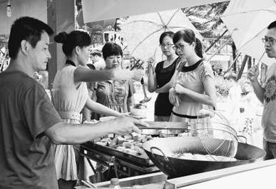 6月14日,游客们在两岸特色庙会上品尝美食。徐林摄