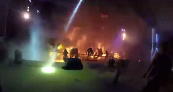 台下民众见到火舌后观众急忙逃走,舞台上的工作人员最初吓呆了,未有作出反应。过了不久,工作人员用灭火筒救火,怎料反而令粉尘飞扬,火势愈来愈大。许多人实时全身着火,痛苦地在地上打滚,四处逃窜。