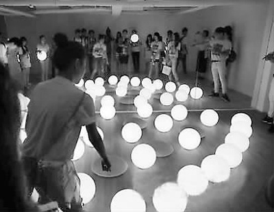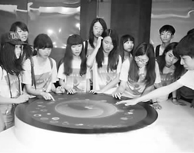学生观看米亚艺术中心的艺术装置。王慧珊摄