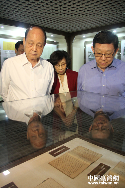 24日下午,海协会会长陈德铭夫妇与海基会董事长林中森夫妇一起在福州马尾参观了中国船政文化博物馆,图为海协会会长陈德铭与海基会董事长林中森参观当年海校学生的笔记本。(中国台湾网 张洁 摄)