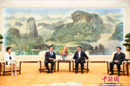 资料图:9月1日上午,中共中央总书记习近平在北京会见了来京参加中国人民抗日战争暨世界反法西斯战争胜利70周年纪念活动的连战等台湾各界代表人士。中新社发 盛佳鹏 摄