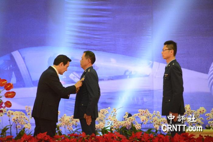 马英九在经国号战机换装典礼上表场有功人员。 图片来源:香港“中评社”