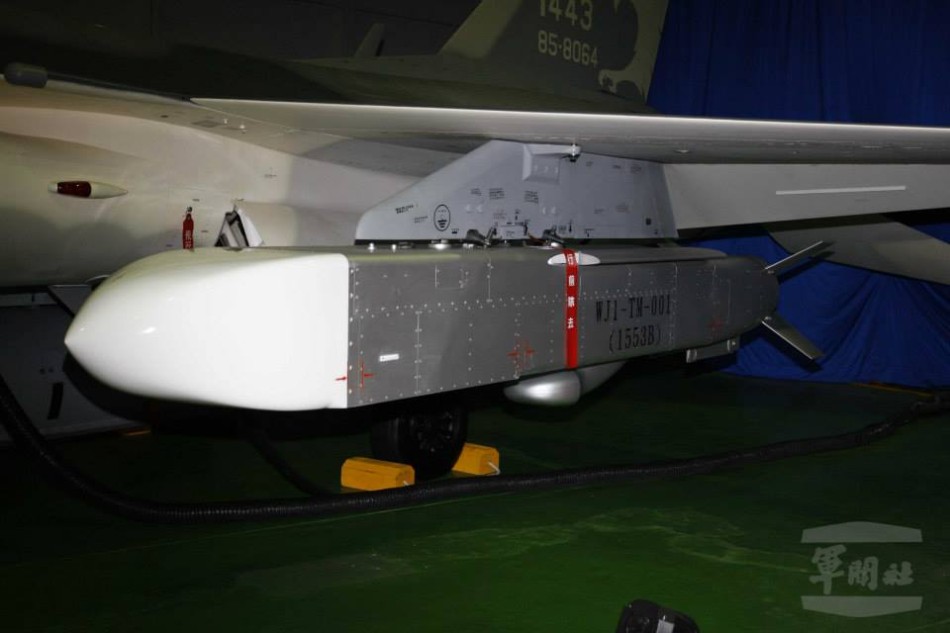 资料称其与美军现役的AGM-154联合防区外武器(JSOW)相同,具有次弹头攻击特性,弹射及推间进方式与英、法合作生产的“风暴之影”(Storm Shadow)相同。但中山科学研究院尚不愿説明该弹种确切射程。(图为马英九视察台湾IDF战斗机部队)