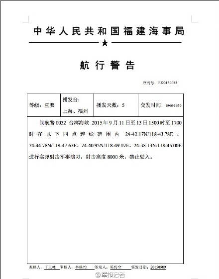 据中国海事局网站消息,解放军9月11日至13日15时至17时在台湾海峡以下四点连线范围内24-42.17N/118-43.78E、24-44.78N/118-47.67E、24-40.95N/118-49.07E、24-38.13N/118-45.00E进行实弹射击军事演习,射击高度8000米,禁止驶入。