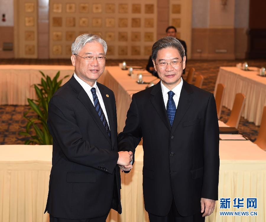 10月14日,国台办主任张志军(右)与台湾方面陆委会主委夏立言在会面时握手。当日,国台办主任张志军在广州与台湾方面陆委会主委夏立言举行工作会面。 新华社记者 陈晔华 摄