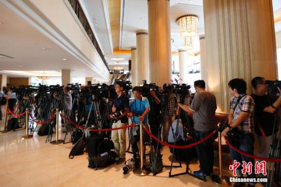 11月6日,新加坡香格里拉酒店,工作人员在安装安检设备。两岸领导人习近平与马英九将于11月7日在此会面。中新社记者 盛佳鹏 摄