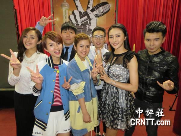“2015中国好声音,台湾校园行”音乐会,陈冰、谭轩辕、江源东、李文豪等大陆歌手,以及舞思爱、晨悠组合(郭惟晨、吴以悠)等台湾歌手兴奋合影。陈冰(右二)说,台湾好吃的美味,多到数不完。(中评社 吴政峯摄)