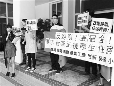 因“三限六不”等政策,在台就读的陆生常遭到不公平对待。图为台湾世新大学学生劳动权益行动小组抗议要求校方正视陆生住宿权益。(资料图片)