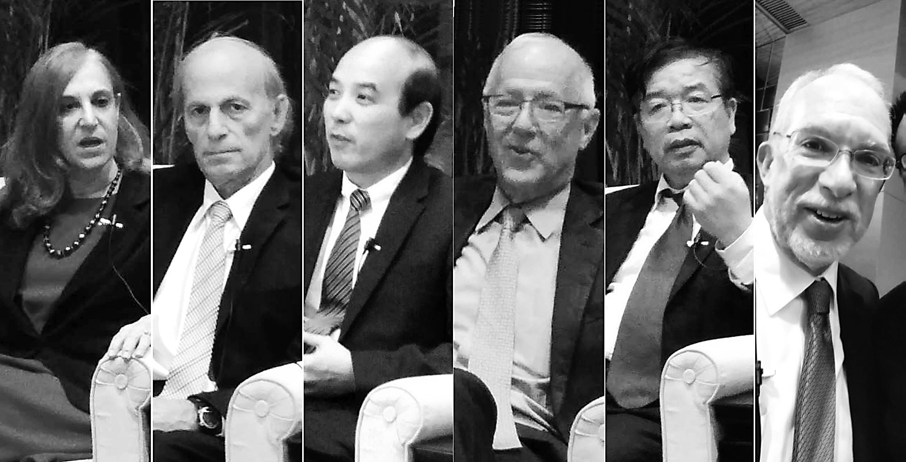 自左至右:美国国际战略研究中心高级顾问葛来仪、布鲁金斯学会高级 研究员杰弗里·贝德、中国现代国际关系研究院副院长袁鹏、美中关系全国 委员会会长斯蒂芬·欧伦斯、上海社会科学院副院长黄仁伟、布鲁金斯学会 高级研究员埃文斯·李维亚。