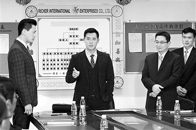 该剧男主角窦智孔(左二)饰演的台商原型——东莞台商张朝宗(右二)也在剧中客串。(图片来自剧组)