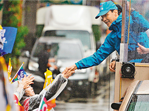 国民党“大选”候选人朱立伦(右)6日到新北市新店区车队扫街拜票,滂沱大雨无阻支持者的热情。