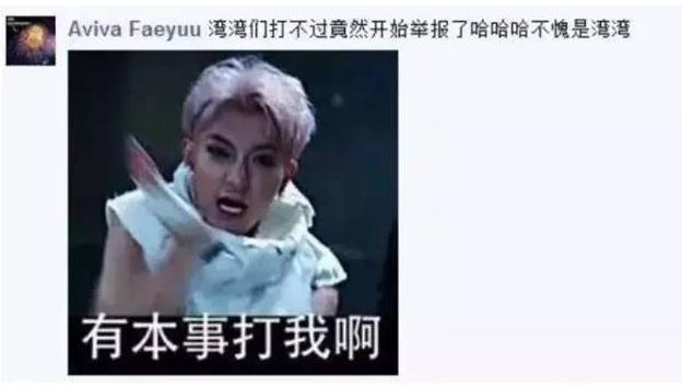 目前,在大陆网友成千上万种“表情包”(而且图片和语言还都不重样)的轰炸下,部分内心脆弱的台湾网民被呛得直接找Facebook网站方面举报,称大陆网友的“表情包”太粗暴;也有一些内心坚强的台湾网民,则选择“盗用”大陆网友的图片素材,重新制成他们的表情包进行“还击”…
