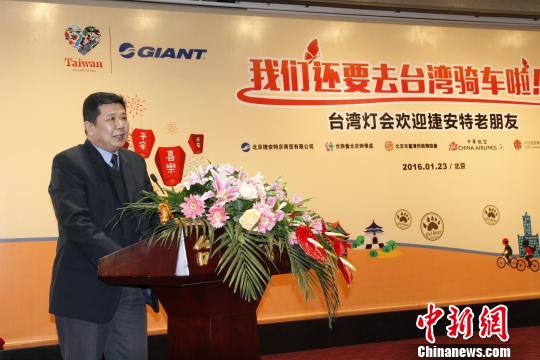 1月23日,台湾海峡两岸观光旅游协会北京办事处与台资企业北京捷安特公司异业合作,举办“我们还要去台湾骑车啦——台湾灯会欢迎捷安特老朋友”优质行程推介会。图为北京市台办主任汪明浩致辞。 陈小愿 摄