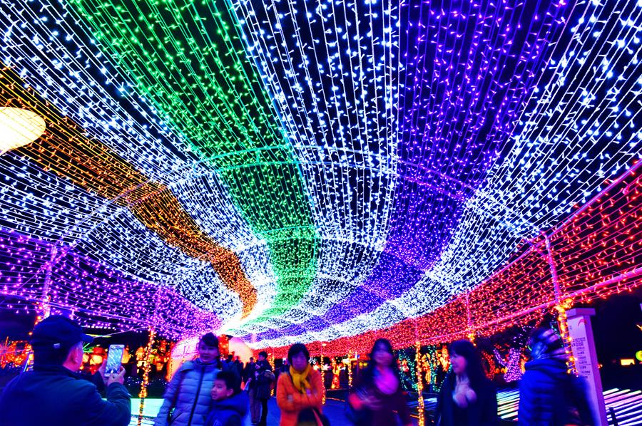 游客在台北元宵灯会上的花灯遂道下游览(2月19日摄)。元宵节将至,以“福禄猴”为主题灯的台北元宵灯会亮灯,千姿百态、情趣盎然的花灯吸引了众多市民和游客前来观赏。 新华社记者 张国俊 摄