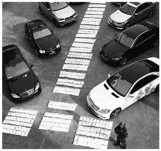 警方缴获贩毒团伙使用的豪车及摆满操场的717公斤冰毒
