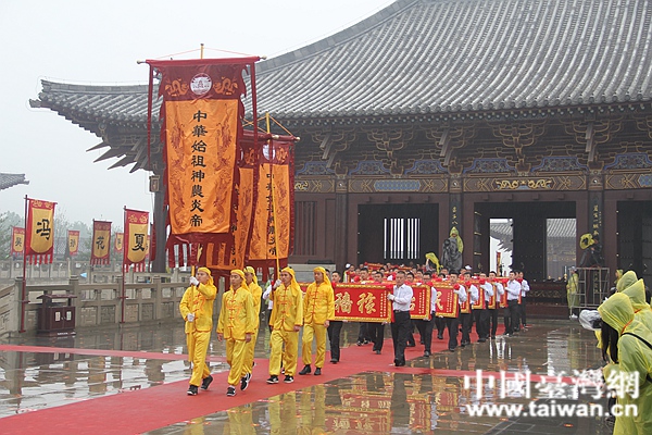9时30分,3000余名两岸同胞在三面印有“中华始祖神农炎帝”字样的彩旗引领下,随舞龙舞狮队、八音会队、銮仪队和炎帝神轿,庄重肃穆地走过祭祀大道,穿过山门、始祖殿、缓缓走入炎帝大殿前的祭祀广场。