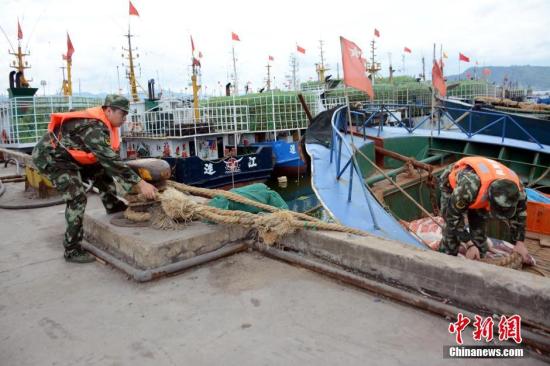 资料图:7月8日,今年第1号台风“尼伯特”在台湾省台东县太麻里乡沿海登陆后,已进入台湾海峡,向福建沿海逼近。福建省公安边防总队罗源县边防大队调集官兵坚守罗源湾港务码头二级避风港,开展安全巡查,劝离个别回流渔船民。陈昭影 摄