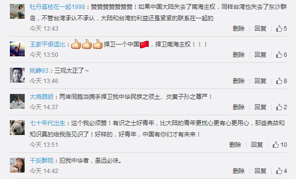 网友@大络腮胡表示:两岸同胞当携手捍卫我中华民族之领土、炎黄子孙之尊严!网友a_2070586405在微博下方评论中写道:只有放宽眼界才谈得上胸怀,放眼未来,以大局为重,这才是真正的中华民族的胸怀!