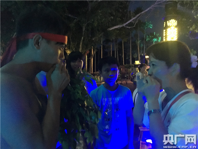 黎族阿哥交台湾乡亲吹叶笛。(央广网记者 李展鸿 摄)