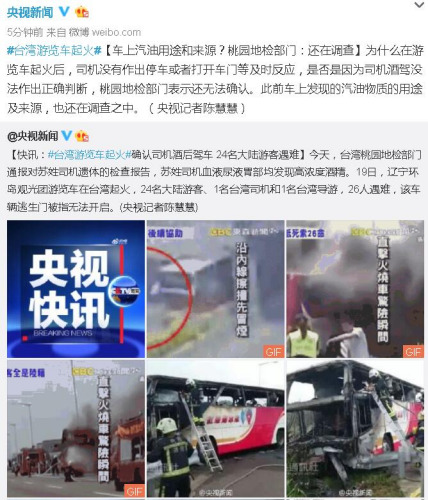 为什么在游览车起火后,司机没有作出停车或者打开车门等及时反应,是否是因为司机酒驾没法作出正确判断,桃园地检部门表示还无法确认。此前车上发现的汽油物质的用途及来源,也还在调查之中。(央视记者陈慧慧)