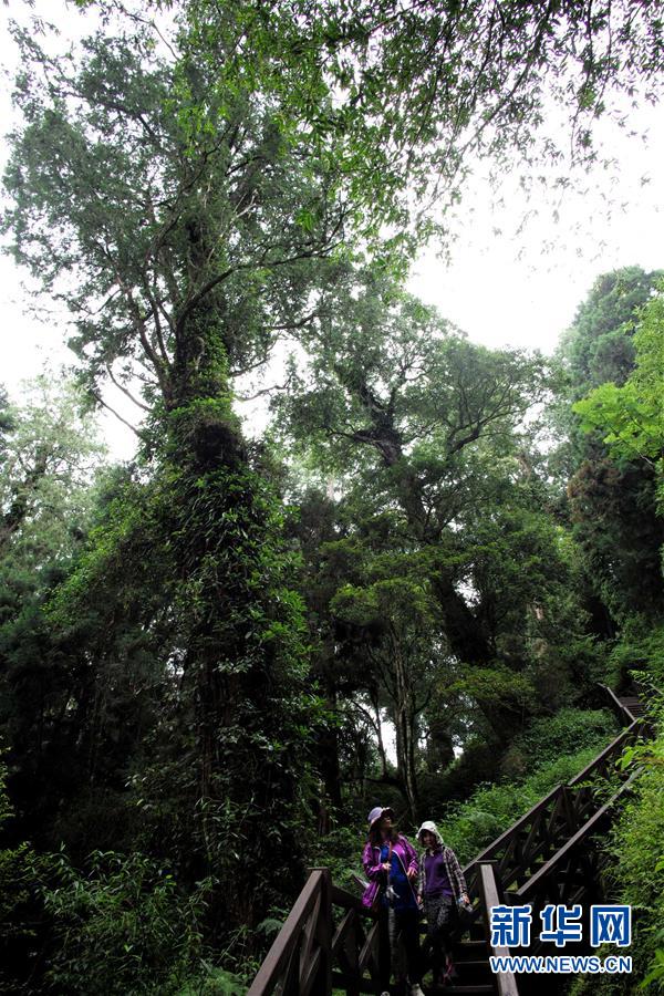 8月5日,游客在阿里山的参天古树林中游览。阿里山位于台湾中南部,最高海拔2663米。这里山区气候温和,群峰环绕、山峦叠翠、林木葱翠、巨木参天,其中阿里山的日出、云海、晚霞、森林与高山铁路尤为称奇,是理想的避暑胜地。新华社记者宋振平摄