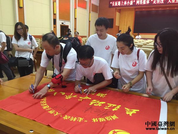 8月30日,“长征路上奔小康”网络媒体“走转改”湖南站采访活动在怀化市启动。图为出发前,采访团成员在队旗上签名。(中国台湾网 朱炼 摄)