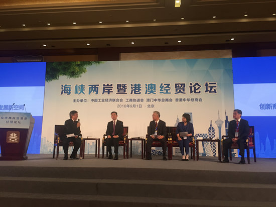 人民网北京9月1日电 1日上午,中国工业经济联合会、工商协进会、澳门中华总商会和香港中华总商会在北京举行第五届“海峡两岸暨港澳经贸论坛”。论坛旨在促进海峡两岸暨港澳地区间的经贸合作与交流,以“新常态、新思路、新机遇、新发展”为主题,着重探讨两岸四地在新形势下,如何有效整合配置资源,促进经济转型,加强协同创新,克服挑战,迎接发展新契机。