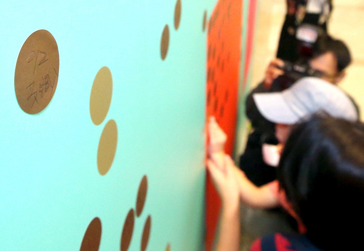 据台湾《联合报》报道,520政党轮替后,蔡英文办公室首次开放参观,今日(18日)一早就有许多民众排队等候。据悉,现场安排民众在背板贴上祝福的金色贴纸,有陆客写上“九二共识”表祝福。