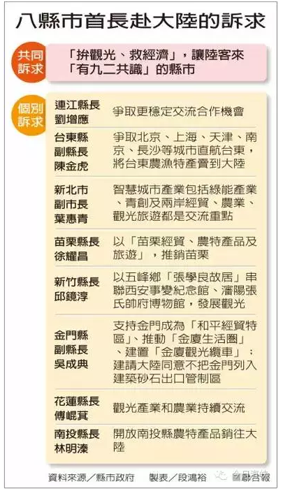 正是这样强大的民意促成了此次台湾8县市负责人的大陆之行。国民党籍南投县长林明溱表示,大陆游客不去,观光大县南投是重灾区,症结在于“两岸关系紧绷”,与其在台北街头呐喊抗议,不如直接到大陆面谈。