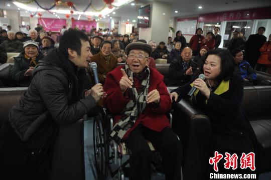 2014年2月22日,被誉为“词坛泰斗”的庄奴老人在重庆医科大学附属第一医院青杠养护中心和老人们共度自己93岁生日。图为庄奴老人正在自己生日会上献唱。陈超 摄