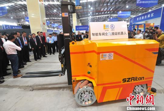 图为与会领导嘉宾参观智能车间全向搬运机器人。 张斌 摄
