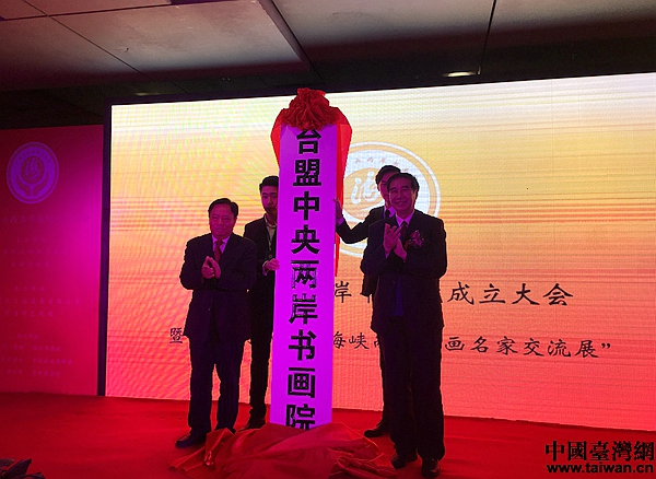 台盟中央常务副主席黄志贤(右一)与台盟中央两岸书画院院长梁国扬(左一)为台盟中央两岸书画院揭牌。(中国台湾网 齐昕 摄)