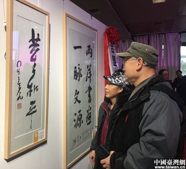 嘉宾欣赏星云大师书法作品《共享和平》。(中国台湾网 齐昕 摄)
