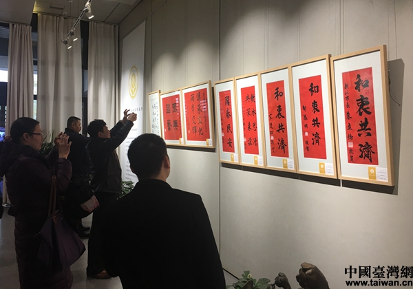嘉宾为连战、吴伯雄、朱立伦等人所赠书法作品拍照留念。(中国台湾网 齐昕 摄)
