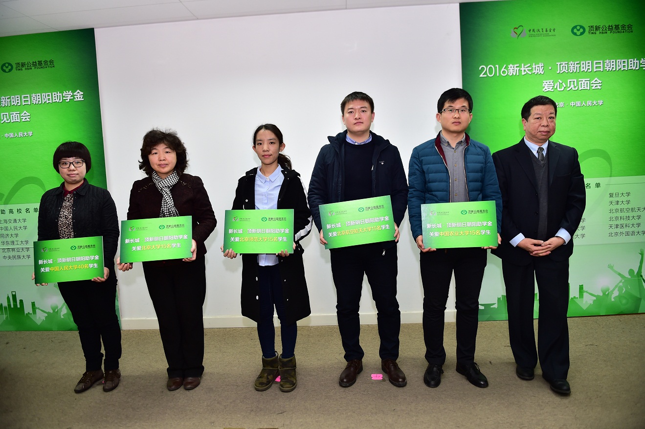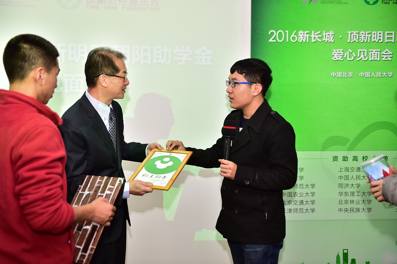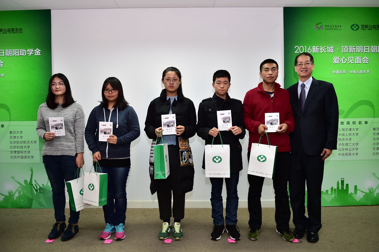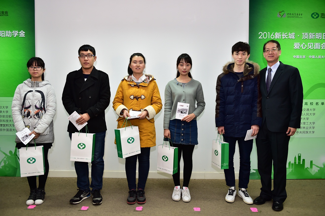 “顶新明日朝阳奖学金”于2007年开展,旨在全国范围内帮助成绩优异、家境清贫的大学生,帮助他们顺利完成大学学业,成人、成才回馈社会的持续项目。持续十年的奖学金项目已惠及超过2500名清贫优秀的大学学子,累计捐助奖助学金950万元。2015年,顶新公益基金会在中国扶贫基金会设立“新长城·顶新明日朝阳助学金”,为成绩优异、家境清贫、品德正直的大学生提供助学金支持,资助额度为每人3000元。两年以来,顶新公益基金会累计捐赠214.65万元,资助了19所高校605名学生,为他们提供经济资助。同时,顶新公益基金会还注重提升同学们的个人能力,帮助同学们成长成才,支持开展“大学生公益社团领袖集训营暨新长城自强社社长培训班”,为学生提供学习和交流的机会。中国扶贫基金会江绍高副会长为活动致辞,并对同学们提出殷切希望,期待同学们能够珍惜来自社会的关爱,努力锻造自己,成为有用之才,不负爱心,不负众望。