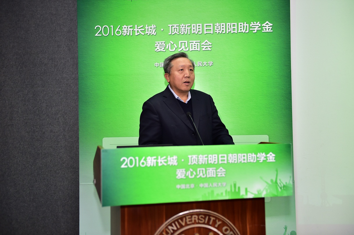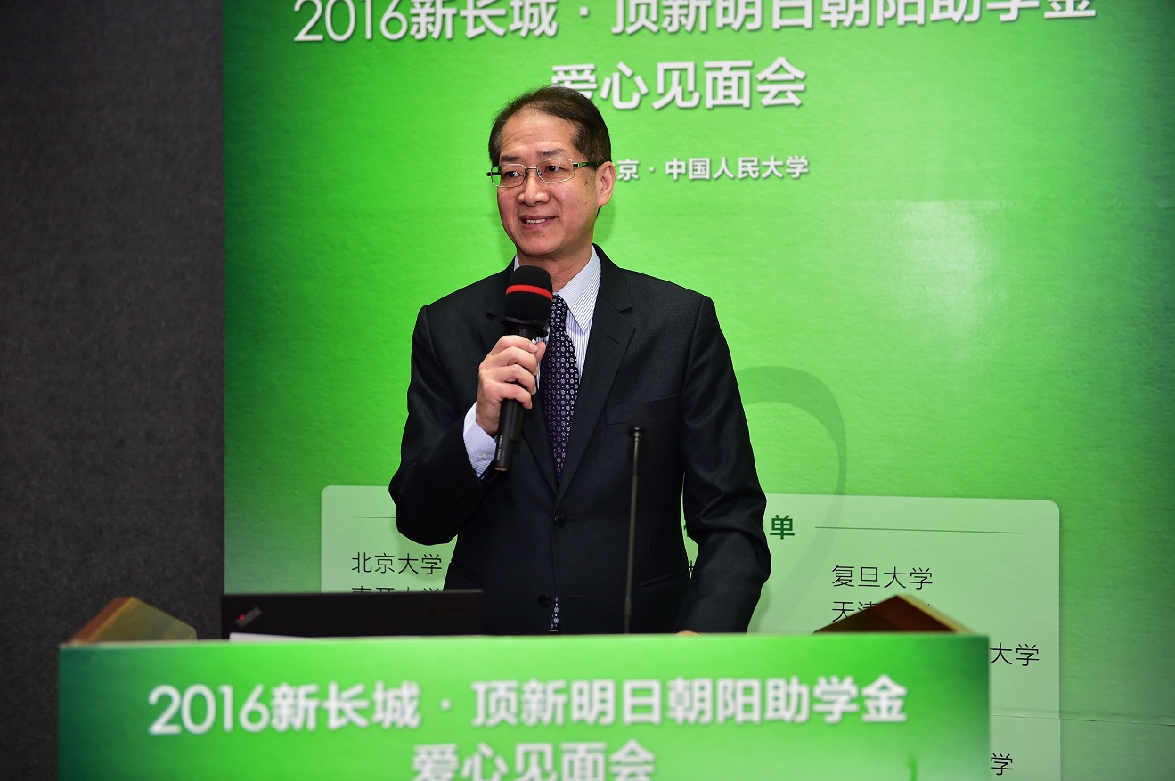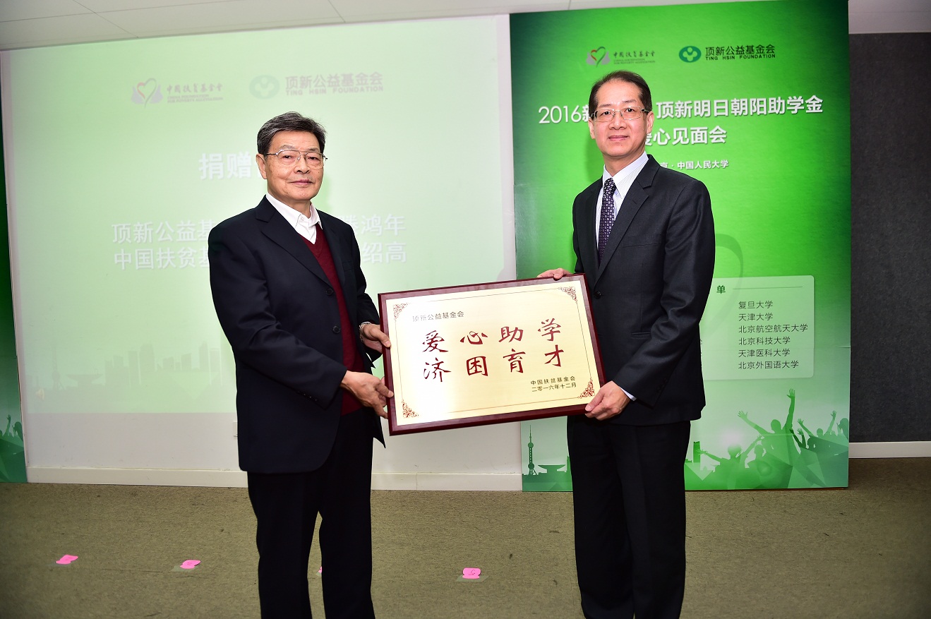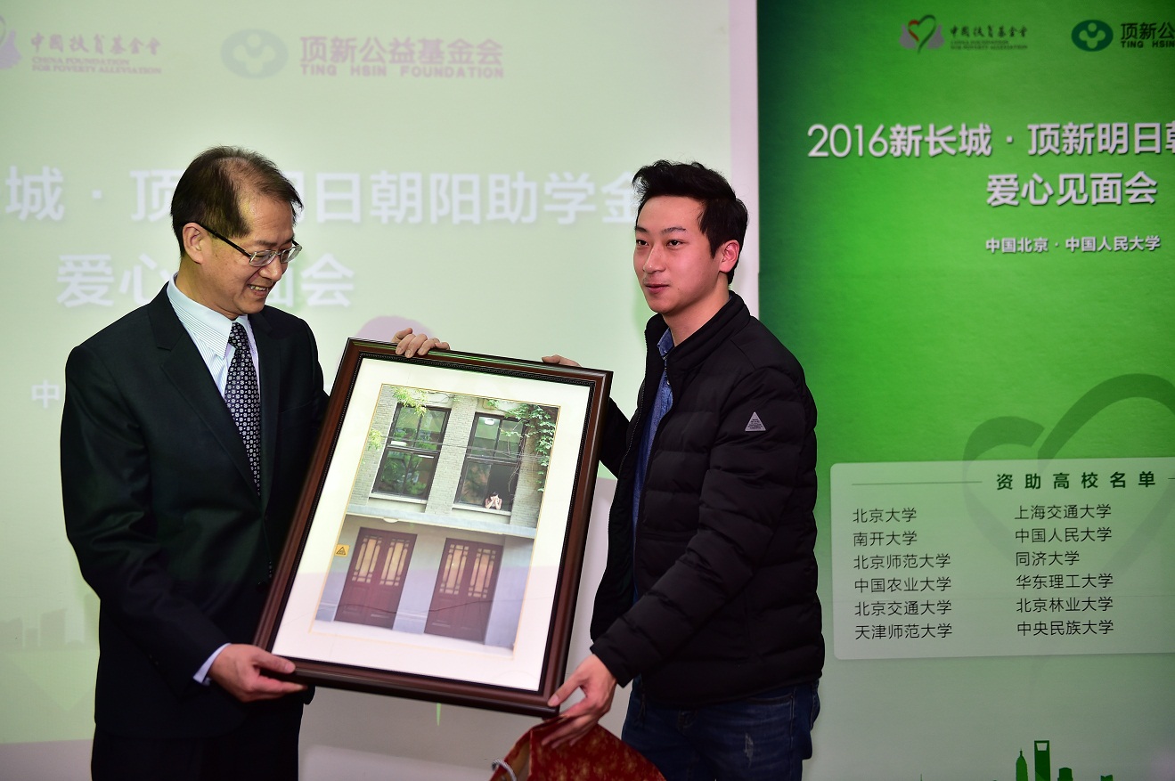 “顶新明日朝阳奖学金”于2007年开展,旨在全国范围内帮助成绩优异、家境清贫的大学生,帮助他们顺利完成大学学业,成人、成才回馈社会的持续项目。持续十年的奖学金项目已惠及超过2500名清贫优秀的大学学子,累计捐助奖助学金950万元。2015年,顶新公益基金会在中国扶贫基金会设立“新长城·顶新明日朝阳助学金”,为成绩优异、家境清贫、品德正直的大学生提供助学金支持,资助额度为每人3000元。两年以来,顶新公益基金会累计捐赠214.65万元,资助了19所高校605名学生,为他们提供经济资助。同时,顶新公益基金会还注重提升同学们的个人能力,帮助同学们成长成才,支持开展“大学生公益社团领袖集训营暨新长城自强社社长培训班”,为学生提供学习和交流的机会。中国扶贫基金会江绍高副会长为活动致辞,并对同学们提出殷切希望,期待同学们能够珍惜来自社会的关爱,努力锻造自己,成为有用之才,不负爱心,不负众望。