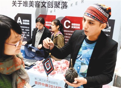 近日,福州举办第二届三坊七巷文创节暨2016福建手作之美大展。图为台湾青年周世豪(右一)也来“练摊”,展示台湾少数民族的文创艺术品。刘可耕摄