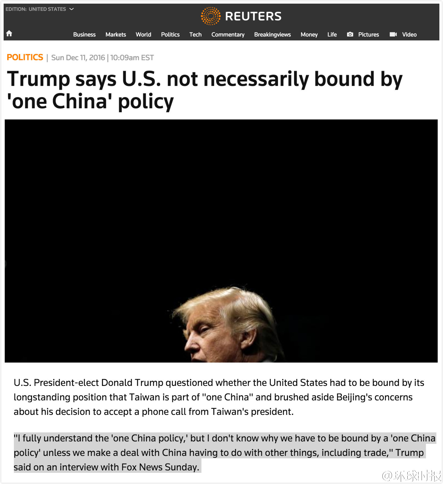 特朗普周日接受福克斯新闻采访时说道:“我充分理解‘一个中国政策’,可除非我们与中国在包括贸易等其他方面有利益交换,我不懂我们为啥非要被这个政策限制住。”