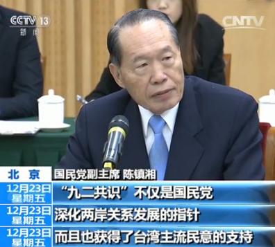 国民党副主席陈镇湘:“九二共识”不仅是国民党深化两岸关系发展的指针,而且也获得了台湾主流民意的支持。虽然本党目前处境艰辛,但是我们力求维护台海和平稳定、造福两岸民众福祉的决心不会改变。